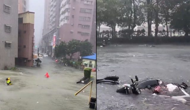 Stasiun televisi Taiwan menunjukkan gambar-gambar jalanan yang terendam banjir di kota-kota dan kabupaten di seluruh pulau.