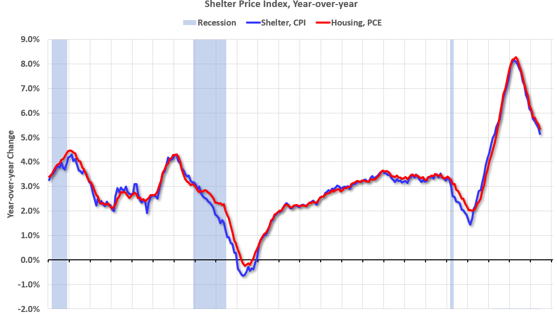 Berikut adalah grafik perubahan shelter dari laporan CPI dari tahun ke tahun dan perumahan dari laporan PCE pagi ini, keduanya hingga Juni 2024.