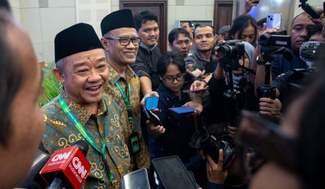 Ketua Umum PP Muhammadiyah Haedar Nashir (kedua kiri) bersama Sekertaris Umum PP Muhammadiyah Abdul Mu’ti (kiri)(ANTARA FOTO/Andreas Fitri Atmoko)