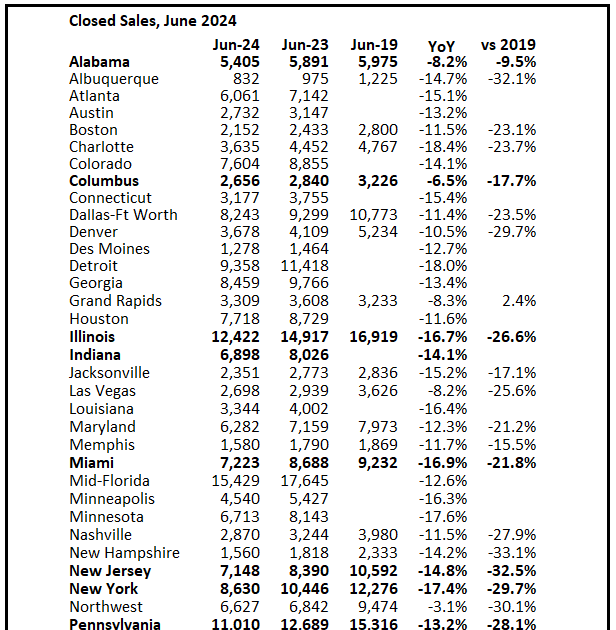 …Ini merupakan penurunan NSA dari tahun ke tahun untuk pasar-pasar ini. Namun, terdapat dua hari kerja lebih sedikit pada bulan Juni 2024 dibandingkan dengan bulan Juni 2023 (19 vs 21), sehingga penjualan yang disesuaikan secara musiman jauh lebih tinggi daripada yang ditunjukkan oleh data NSA. Perhatikan bahwa NAR melaporkan penjualan NSA turun 13,4% YoY di bulan Juni, hampir sama dengan data lokal ini!