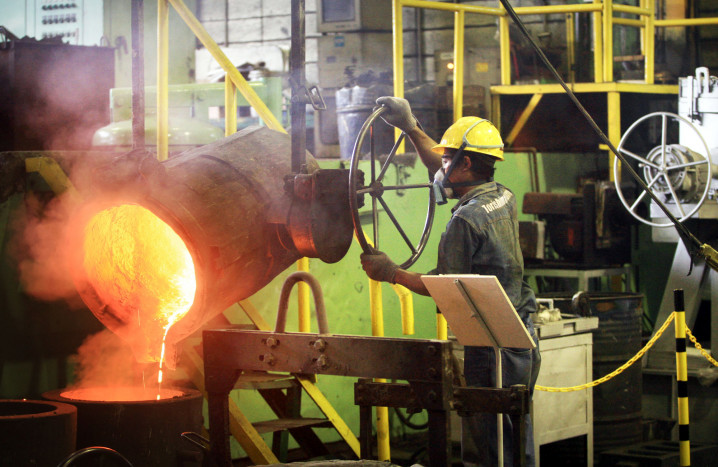 Pekerja tengah menuangkan cor baja untuk cetakan.(Antara)