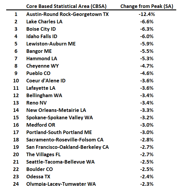 Untuk kota-kota (Area Statistik Berbasis Inti, CBSA), berikut adalah 30 kota dengan penurunan terbesar dari puncaknya, disesuaikan secara musiman. Austin terus menjadi kota dengan kinerja terburuk.