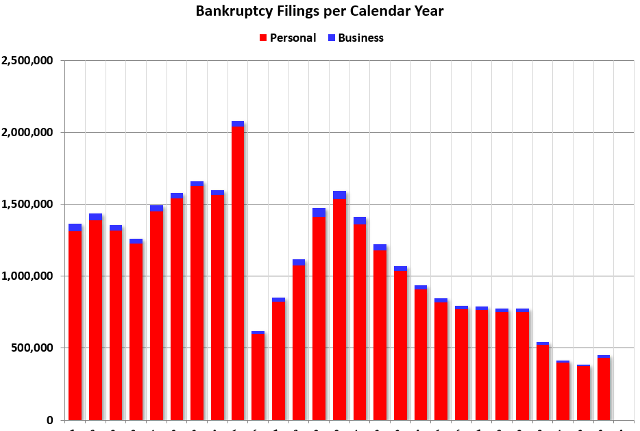 Grafik ini menunjukkan pengajuan kebangkrutan bisnis dan non-bisnis berdasarkan tahun kalender sejak 1997.