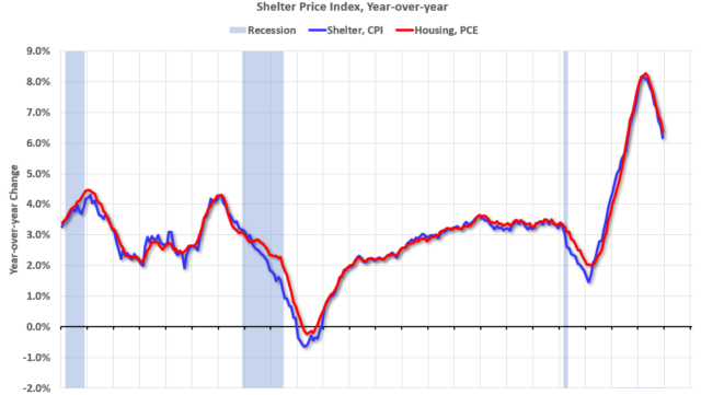Berikut adalah grafik perubahan shelter dari laporan CPI dari tahun ke tahun dan perumahan dari laporan PCE pagi ini, keduanya hingga Desember 2023.