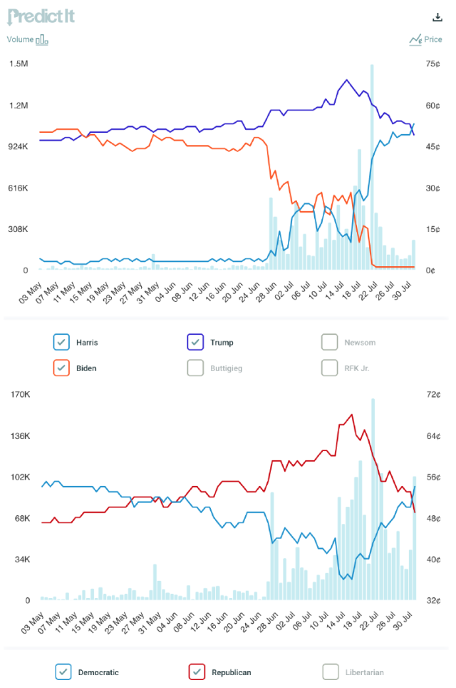 Pada awal Mei, pasar memberi Biden sedikit keunggulan dalam persaingan yang diperkirakan akan berlangsung sengit. Pada pertengahan bulan Mei, Trump telah unggul dibandingkan Biden dalam hal kemungkinan kemenangan, namun Partai Demokrat tetap unggul dalam hal kontrak partai—para pedagang memperkirakan Harris (atau pihak lain) akan menggantikan Biden sebagai kandidat teratas.