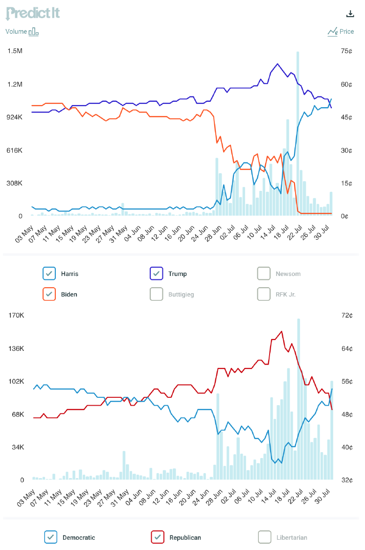 Selama perdebatan harga kontrak Biden turun tajam, begitu pula harga kontrak Partai Demokrat, sedangkan harga kontrak Harris naik. Tren ini berlanjut ketika tekanan meningkat pada Biden untuk mundur, dan Harris akhirnya menyalip Biden dalam pasar pemenang presiden pada awal Juli.