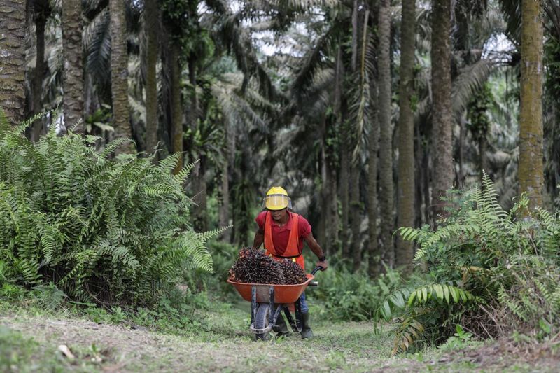 Petani sedang memanen sawit di kebun sawit.(MI)