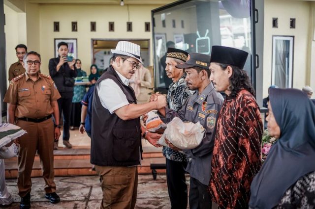 Penjabat Bupati Ciamis Engkus Sutisna menyerahkan bantuan bahan pokok kepada warga.(MI/KRISTIADI)