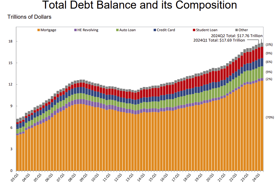 Pusat Data Ekonomi Mikro Federal Reserve Bank di New York hari ini menerbitkan Laporan Kuartalan mengenai Utang dan Kredit Rumah Tangga. Laporan tersebut menunjukkan total utang rumah tangga meningkat sebesar $109 miliar (0,6%) pada Q2 2024, menjadi $17,80 triliun. Laporan ini didasarkan pada data dari Panel Kredit Konsumen perwakilan nasional The Fed New York. Ini mencakup ringkasan satu halaman tentang hal-hal penting yang dapat diambil dan poin data pendukungnya.