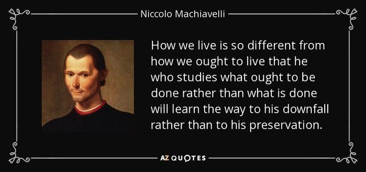 Anda harus melakukan ini sekaligus. Ketika hal itu terjadi, hal itu harus terjadi pada semua orang yang mengalaminya. Ini adalah diktum Machiavelli, dan dia benar. Setelah hal itu terjadi, mereka yang tidak hancur tahu bahwa mereka aman selama mereka tidak menghalangi Anda.