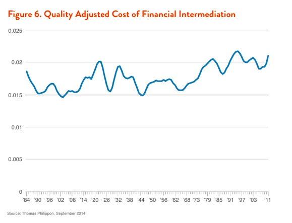 Selain itu, meskipun terdapat peningkatan aktivitas yang sangat besar dan penggunaan teknologi yang meluas, biaya intermediasi keuangan telah meningkat, seperti yang ditunjukkan oleh Walter Turbewille, mengutip sebuah studi oleh Thomas Philippon: