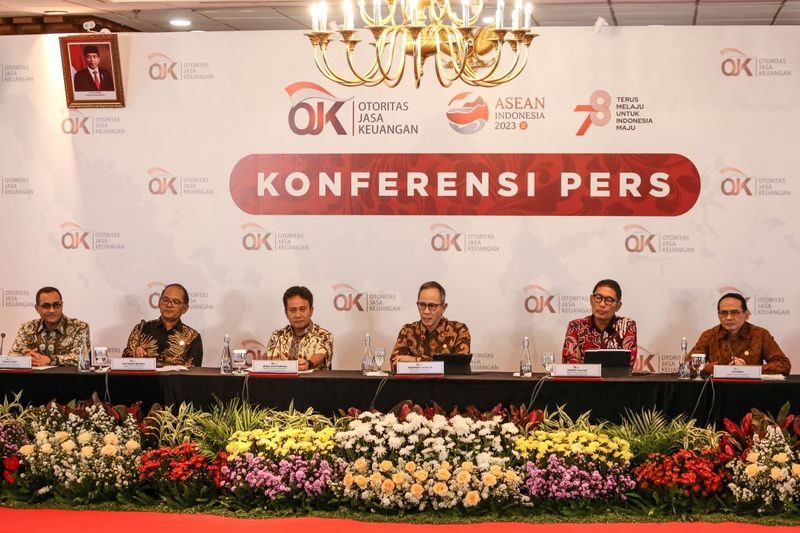Komisioner OJK menggelar konferensi pers Peta Jalan Pengembangan Dan Penguatan Inovasi Teknologi Sektor Keuangan, Aset Keuangan Digital dan Aset Kripto.(Antara)