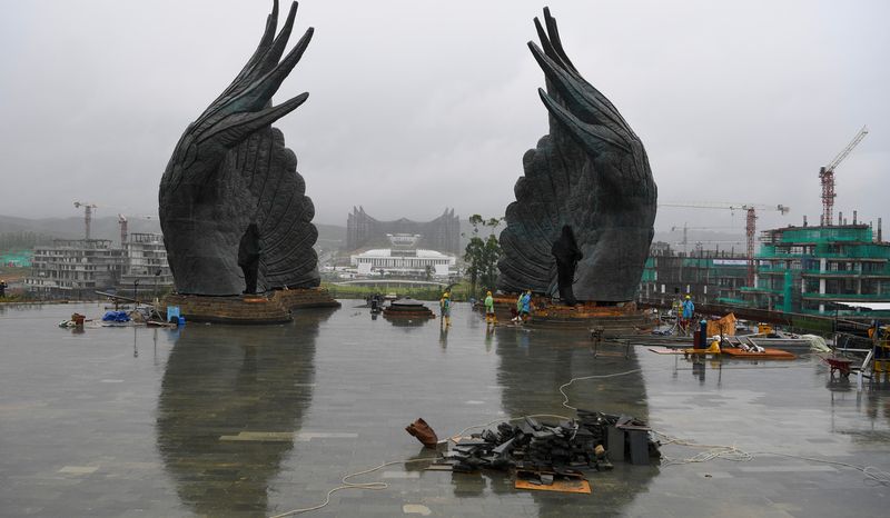 Sejumlah pekerja menyelesaikan pembangunan proyek Memorial Park di IKN.(Dok. Antara)