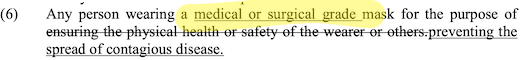 I find much to like in this language (though Peoples CDC disagrees). For one thing, it focuses on visible and testable characteristics of the Health Mask (see here in the previous post), and not on intent. For another, “preventing the spread of contagious disease” is certainly why I wear a mask; I’m preventing the spread both to me, and from me (if I have Covid, but don’t know it). Conveniently, the contagious disease is not specified; many anecdotes testify to the utility of masks in preventing other contagious respiratory dieases, like colds and flu. Finally, it is easy to see how, in future, the language could be modified to protect against, say, allergies or wildfire smoke.