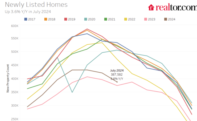 Penjual terus mendaftarkan rumah mereka dalam jumlah yang lebih tinggi pada bulan Juli ini karena rumah yang baru terdaftar berada 3,6% di atas tingkat tahun lalu tetapi jauh lebih rendah dari angka bulan Juni sebesar 6,3%. Ini menandai peningkatan aktivitas pencatatan saham selama sembilan bulan setelah penurunan berturut-turut selama 17 bulan. Perhatikan musim untuk listingan baru. Desember dan Januari secara musiman merupakan bulan-bulan terlemah dalam setahun untuk pencatatan saham baru, diikuti oleh bulan Februari dan November. Listing baru akan meningkat dari tahun ke tahun pada tahun 2024, namun masih di bawah level normal.