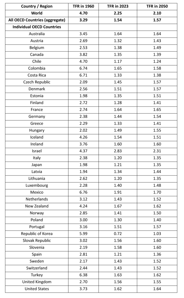 Tabel 1 Tingkat kesuburan total (TFR) negara-negara OECD dan dunia pada tahun 1960, 2023, dan 2050