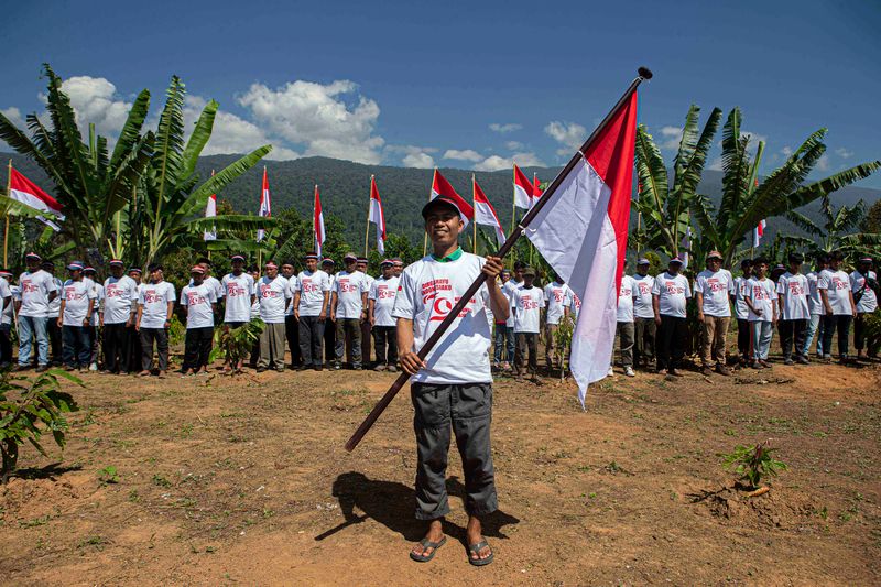 RATUSAN mantan narapidana terorisme (napiter) yang sudah berikrar bersedia kembali kepada NKRI, mengikuti upacara bendera dalam rangka memperingati HUT Kemerdekaan RI ke-79 di lapangan Desa Tabalu, Kecamatan Poso Pesisir, Kabupaten Poso, Sulawesi Tengah, Sabtu (17/8).
