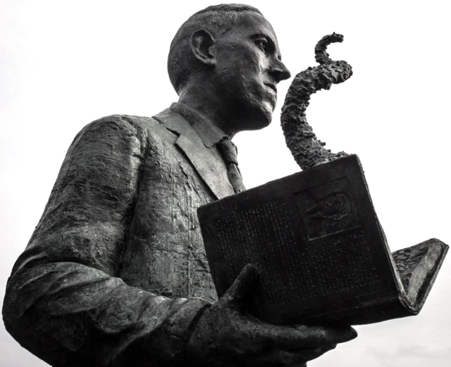 Patung penulis horor HP Lovecraft yang dipahat oleh seniman Gage Prentiss di Providence, RI, tempat penulis dilahirkan dan tinggal selama bertahun-tahun. David Lepage/Wikimedia Commons, CC BY-SA