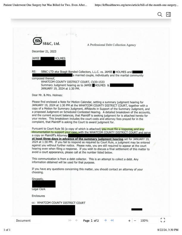 Pusat bedah milik dokter tersebut kemudian dibeli dan ditutup oleh PeaceHealth, sebuah sistem kesehatan regional. Namun utang tersebut diserahkan kepada agen penagihan, SB&C, yang mengajukan gugatan terhadap Holmes pada bulan Desember 2023, meminta $3,792,19, termasuk bunga dan biaya.