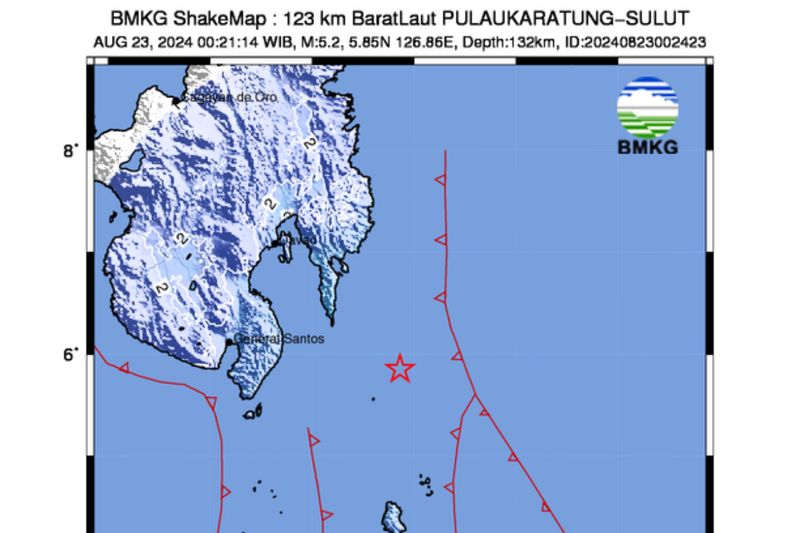 TERJADI gempa bumi magnitudo 5,2 di Pulau Karatung, Sulawesi Utara (Sulut), Jumat (23/8). Peristiwa ini dikabarkan oleh Badan Meteorologi, Klimatologi, dan Geofisika (BMKG) melalui keterangan di media sosial resminya.