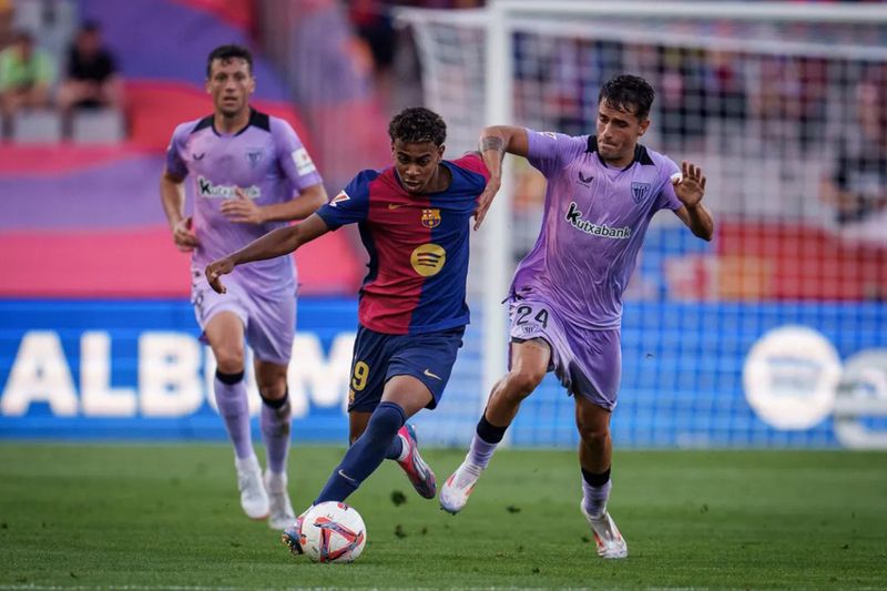 Bintang Barcelona Lamine Yamal (tengah) sedang mempertahankan bola dari pemain Athletic Bilbao dalam laga lanjutan La Liga Spanyol, Minggu (25/8) WIB.(DOK BARCELONA)