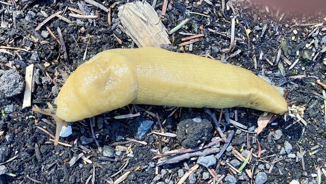 Siput pisang yang saya temui di sepanjang US 101 di utara rumah saya. Terkejut melihat yang begitu kuning, seperti yang biasa saya lihat di Santa Cruz; sebagian besar yang pernah saya lihat di sini di Oregon berwarna lebih kehijauan. Itu pasti pria yang tampan.