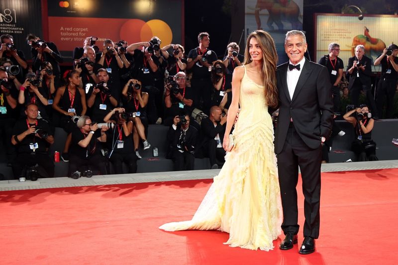 Amal menata rambutnya dengan gaya blow-dry bervolume dan membawa tas clutch kotak berkilauan untuk melengkapi penampilannya yang glamor.