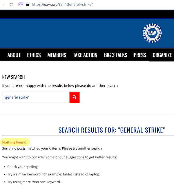 There’s nothing on the UAW site about a general strike at all, now or in the past. So when is that “staffed effort” going to start? From In These Times: