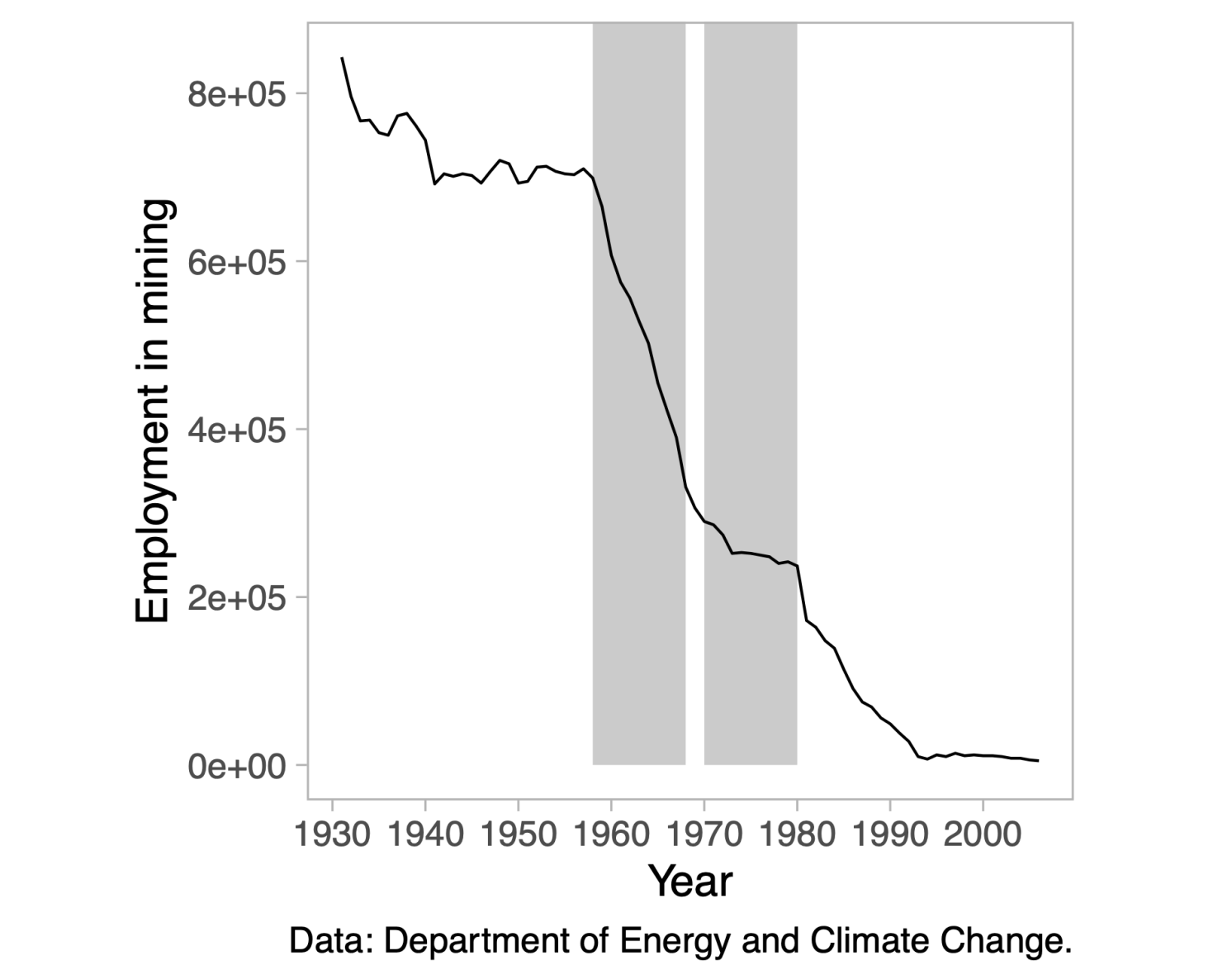 Kami fokus pada jatuhnya industri batu bara Inggris, salah satu kasus penurunan industri paling parah pada abad ke-20. Sejarawan ekonomi telah banyak menulis tentang pentingnya batubara Inggris dalam Revolusi Industri (misalnya Pomeranz 2000, Allen 2009, Wrigley 2010, Fernihough dan O’Rourke 2021). Penambangan batu bara mempekerjakan lebih dari 700.000 orang pada akhir tahun 1950an. Jumlah tersebut berkurang setengahnya dalam satu dekade, menyusul penyusutan industri yang paling dramatis pasca PD2 (lihat Gambar 1). Gelombang penutupan tambang terus menyapu produksi batu bara Inggris hingga akhirnya hilang pada tahun 1990an. Saat ini, wilayah-wilayah bekas ladang batu bara secara konsisten berada di antara wilayah-wilayah dengan tingkat kekurangan tertinggi di negara ini, dan hal ini menjadi perhatian publik yang cukup untuk mendukung pembentukan kelompok riset parlemen yang terdiri dari semua partai yang mengerjakan proposal kebijakan untuk wilayah-wilayah tersebut (All-Party Parliamentary Group tentang Komunitas Coalfield 2023).