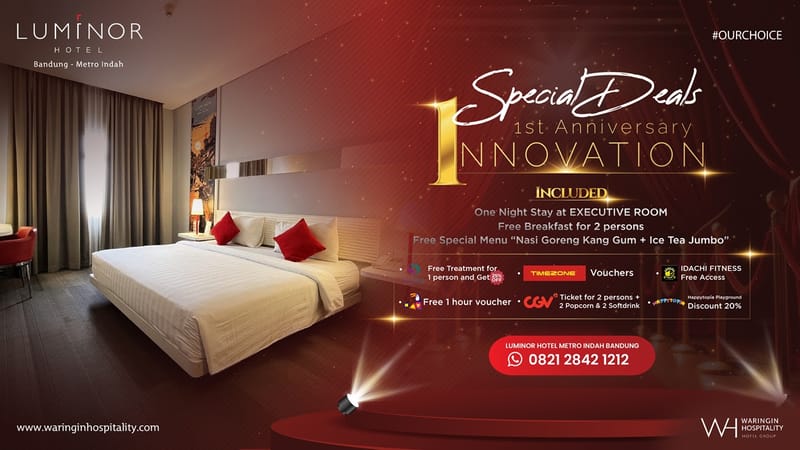 Promo itu sudah termasuk makan pagi dan Gratis Voucher Treatment di Safura Clinic, nonton di CGV, 1 jam karaoke di NAV, IDACHI Fitness, Voucher Timezone, discount 25% di Happytopia Playground, serta gratis 1 pax Nasi Goreng Kang Gum dan Jumbo Ice Tea. Promo ini berlaku mulai dari 1-30 September 2024, yang akan memanjakan seluruh tamu Luminor Hotel Metro Indah Bandung dengan seluruh fasilitasnya.