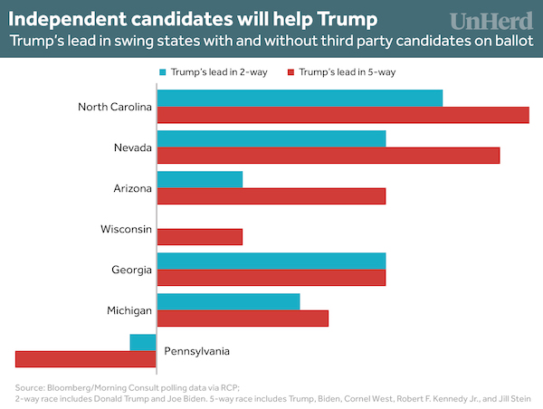 “Third-party candidates could win Trump the White House again” [Unherd]. “Biden is six points ahead of Trump in a two-way national race, but the addition of RFK Jr., Stein and West reduces his lead to just two points in a separate Quinnipiac poll. Kennedy takes the lion’s share of third-party votes, 21%, compared to West and Stein’s 3% and 2%. December polling indicates that a three-way race involving RFK boosts Trump by five points, and it can safely be assumed that Stein and West primarily win votes from would-be Biden supporters. … Any impact of third-party candidates in heavily blue or red states would not bridge the massive margins that Joe Biden or Trump are projected to win in those states — only influence in swing states meaningfully impacts the election. ” • Handy chart: