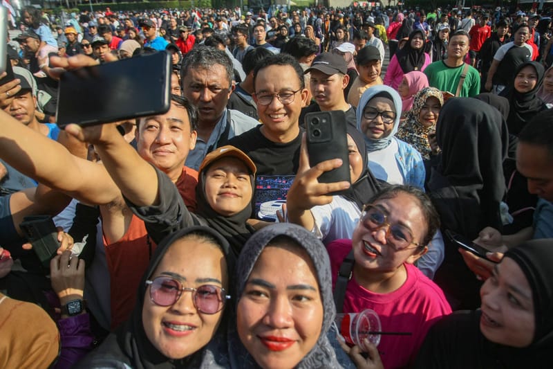 Anies Baswedan dikerumuni warga saat berolahraga di arena car free day (CFD) di kawasan Bundaran HI, Jakarta.(MI/Usman Iskandar)