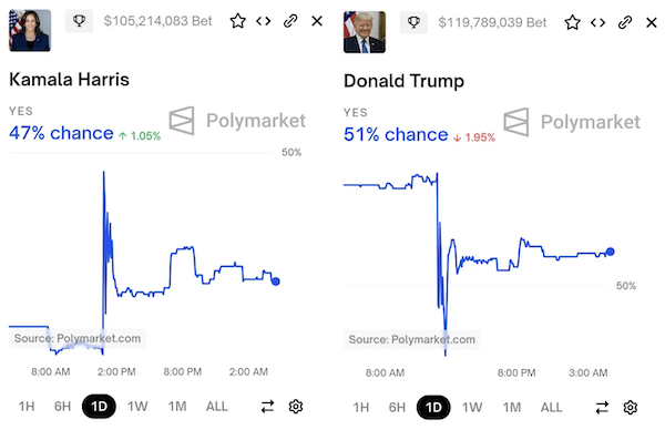 Saat ini terdapat beberapa model statistik dan pasar prediksi yang menghasilkan perkiraan untuk pemilihan presiden mendatang, dan keduanya menunjukkan persaingan yang sangat ketat. Harris unggul dalam perkiraan FiveThirtyEight dan PredictIt, namun tertinggal dalam perkiraan Silver Bulletin dan Polymarket. Perlombaan The Economist pada dasarnya sama.