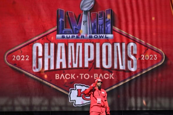 Rapper Tech N9ne saat tampil di Super Bowl 2024.(AFP/ Andre Caballero)