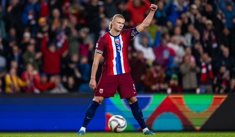 Penyerang Norwegia Erling Haaland melakukan selebrasi usai mencetak gol ke gawang Austria di laga Liga Negara(X @nff_landslag)
