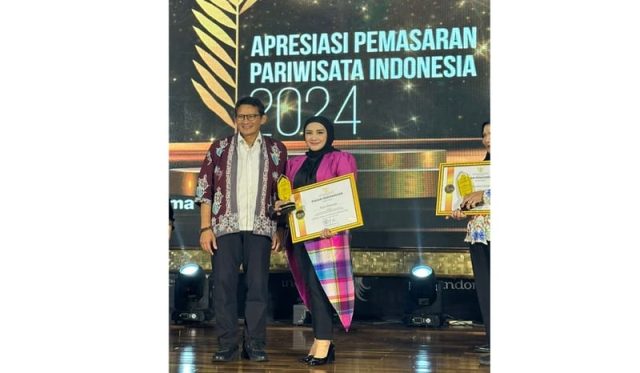 Sekretaris Dinas Pariwisata Kota Makassar Irma Awalia, mewakili Kepala Dinas Pariwisata Kota Makassar, menerima penghargaan langsung dari Menteri Pariwisata dan Ekonomi Kreatif RI, Sandiaga Salahuddin Uno, pada Malam Puncak Apresiasi Pemasaran Pariwisata Indonesia (APPI) 2024 di Balairung Soesilo Soedarman, Gedung Sapta Pesona.