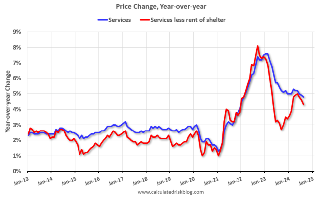 Shelter naik 5,2% tahun-ke-tahun di bulan Agustus, naik dari 5,0% di bulan Juli. Perumahan (PCE) naik 5,3% YoY di bulan Juli, turun dari 5,3% di bulan Juni (dibulatkan).