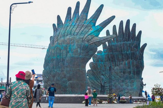 Warga berfoto dengan latar belakang Istana Negara IKN di Taman Kusuma Bangsa, Ibu Kota Nusantara (IKN), Penajam Paser Utara, Kalimantan Timur, Minggu (18/8/2024)(ANTARA/MUHAMMAD ADIMAJA)