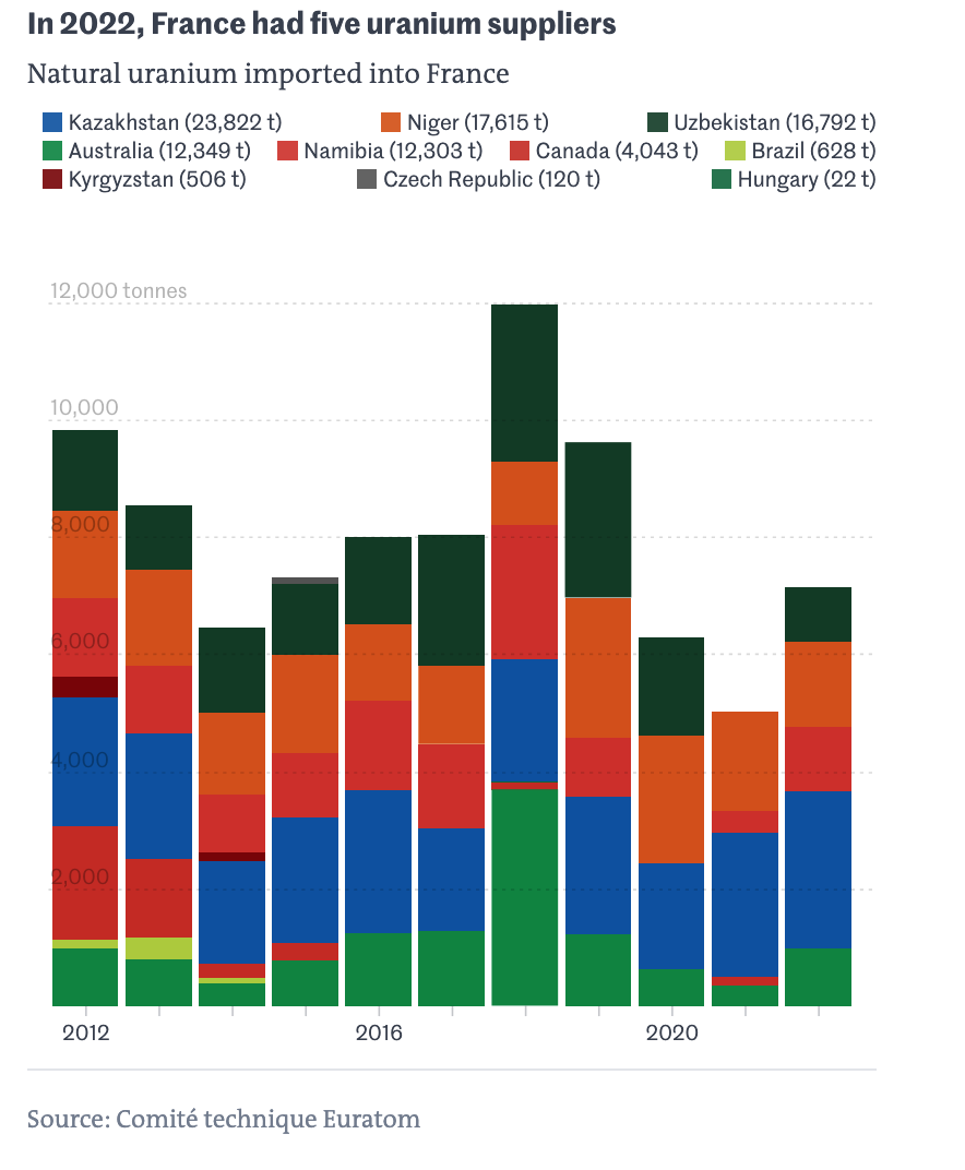 Meskipun tenaga nuklir lebih penting bagi bauran energi Perancis dibandingkan bagi AS (Prancis mengekspor listrik), penggunaan uranium Rusia jauh lebih sedikit. EDF menggunakan sekitar 8.000 ton uranium per tahun, dan sejauh yang saya tahu, hanya 153 ton yang berasal dari Rusia. Bagan dalam artikel tahun 2023 di Le Monde tentang sumber uranium Prancis di Afrika tidak menyertakan Rusia sebagai sumber material: