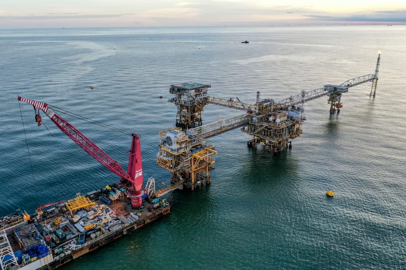 Foto udara anjungan lepas pantai lapangan Bekapai Pertamina Hulu Mahakam di Kalimantan Timur, Rabu (27/3/2024).(Antara)
