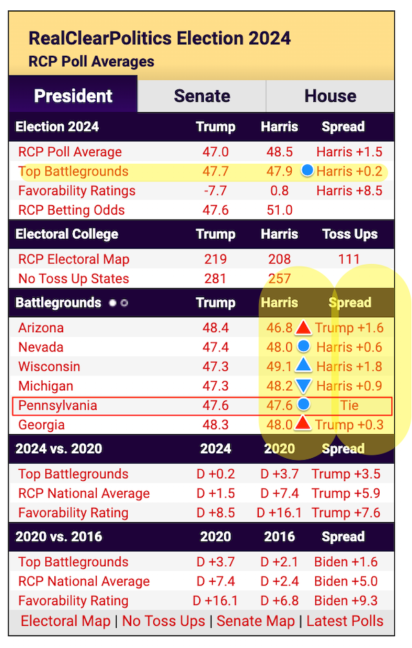 A few polls post-debate, but as of this reading little change. To be fair, it might take some time for sentiment to settle; and the winning margins may at this point be so minute as to be undetectable. Still, the Democrats must be very puzzled to have virtual unanimity across the political spectrum that “Harris is the one” — it was a tidal wave, after the debate — and yet the election is a virtual tie. How can this be? Perhaps a few more Republicans, generals, or celebrities will turn the tide.