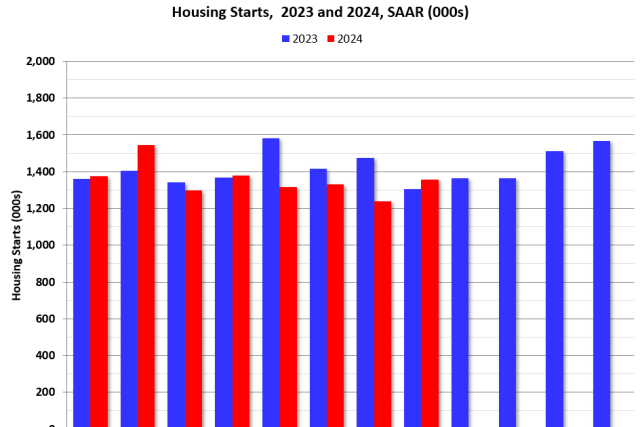Permulaan keluarga tunggal meningkat dari tahun ke tahun dalam 12 dari 14 bulan terakhir, sedangkan multi-keluarga meningkat dari tahun ke tahun hanya dalam 2 dari 14 bulan terakhir. Year-to-date (YTD), total permulaan turun 4,0% dibandingkan periode yang sama pada tahun 2023. Permulaan keluarga tunggal naik 10,4% YTD, dan multi-keluarga turun 32,6% YTD.
