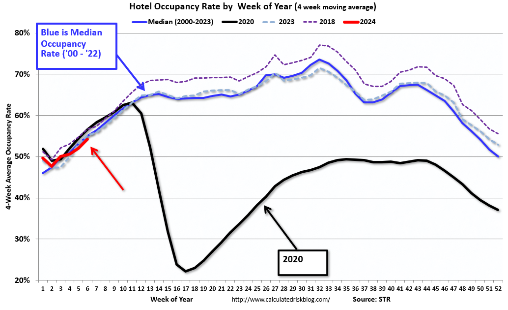 Garis merah tahun 2024, hitam tahun 2020, biru median, dan biru muda putus-putus tahun 2023. Garis ungu putus-putus tahun 2018, tahun rekor okupansi hotel.