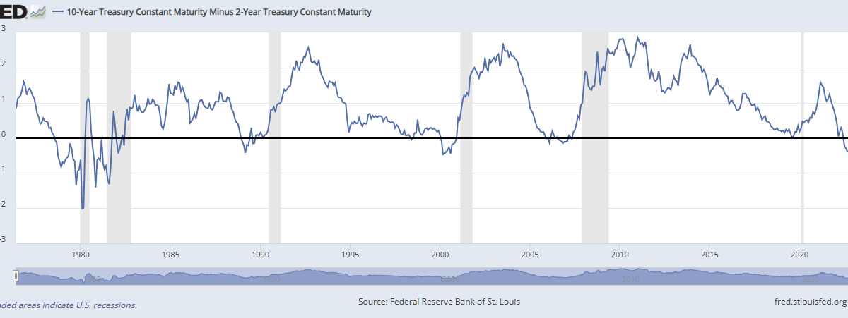 Berikut adalah grafik terkini dari Jatuh Tempo Konstan Treasury 10 Tahun Dikurangi Jatuh Tempo Konstan Treasury 2 Tahun dari FRED sejak tahun 1976.