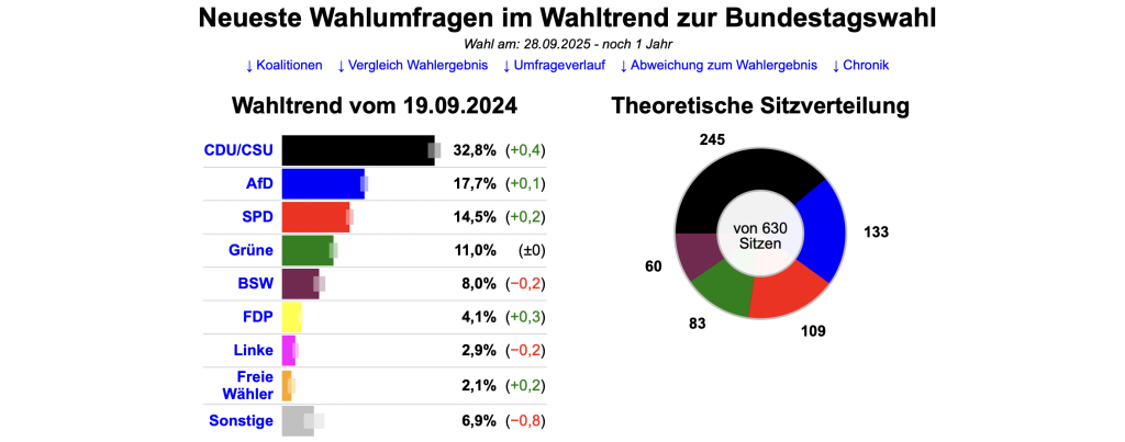 And it’s possible that similar coalition math could be in play after next year’s national elections if the AfD and BSW can continue to peel away voters from the Atlanticist center. Here’s the current state of polling: