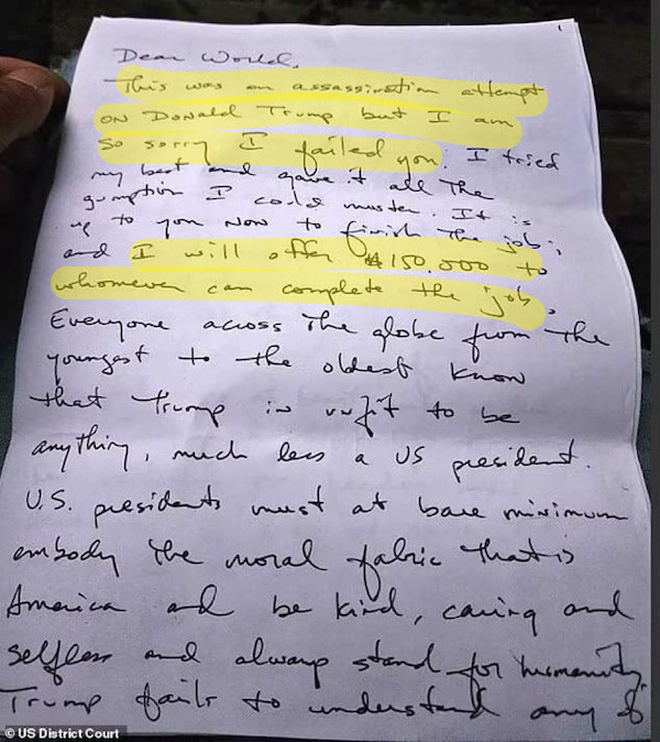 “Man suspected of assassination attempt against Trump left a letter detailing his plans, prosecutors say” [CNN]. “The man who authorities say sat with a rifle in the trees where Donald Trump was golfing earlier this month in West Palm Beach, Florida, previously wrote a letter stating ‘this was an assassination attempt on Donald Trump,’ according to a new filing by federal prosecutors. A witness told investigators that Ryan Wesley Routh had dropped off a box at his home months before, which “contained ammunition, a metal pipe, miscellaneous building materials, tools, four phones, and various letters.” After learning of the apparent assassination attempt, the witness opened the box, according to the filing…. Prosecutors say Routh was in the area of Trump’s golf course and the former president’s Mar-a-Lago residence across multiple days in the month before he was arrested and had a Google search of how to travel from Florida to Mexico in one of his phones.” • So Routh was a planner, not just a child-like goo goo, and had some amount of funding (making the role of at least the girlfriend more salient. Here is the letter: