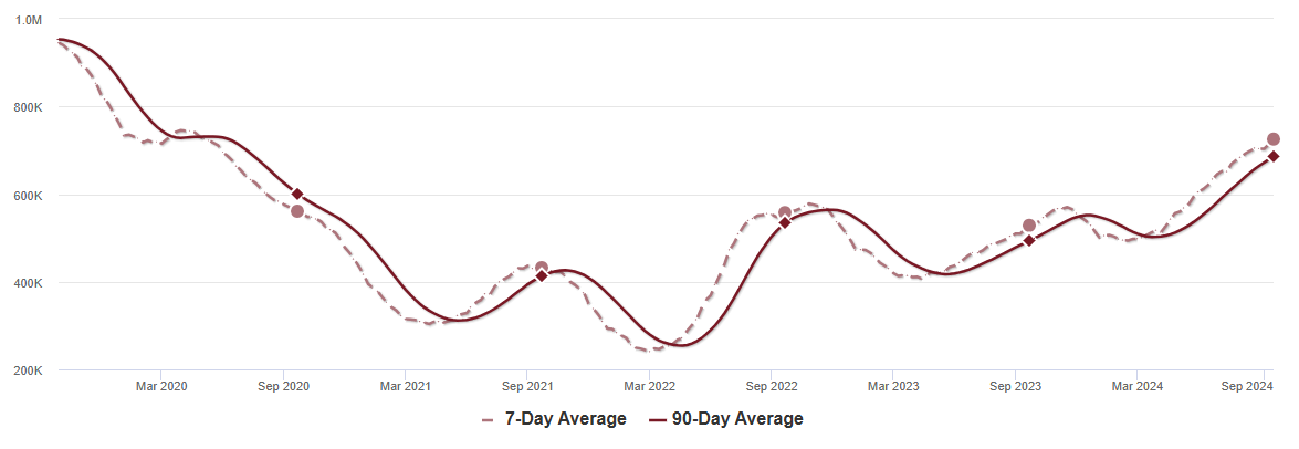 Persediaan naik 37,2% dibandingkan minggu yang sama tahun 2023 (minggu lalu naik 37,4%), dan turun 24,0% dibandingkan minggu yang sama tahun 2019 (minggu lalu turun 25,2%).