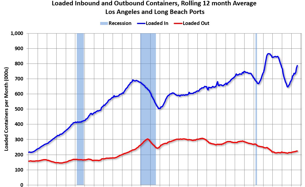 Grafik berikut menunjukkan lalu lintas masuk dan keluar di pelabuhan Los Angeles dan Long Beach dalam TEUs (TEUs: unit setara 20 kaki atau kontainer kargo sepanjang 20 kaki).