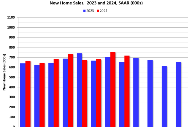 …Grafik berikutnya menunjukkan penjualan rumah baru untuk tahun 2023 dan 2024 berdasarkan bulan (Tarif Tahunan Penyesuaian Musiman). Penjualan Agustus 2024 naik 9,8% dibandingkan Agustus 2023.