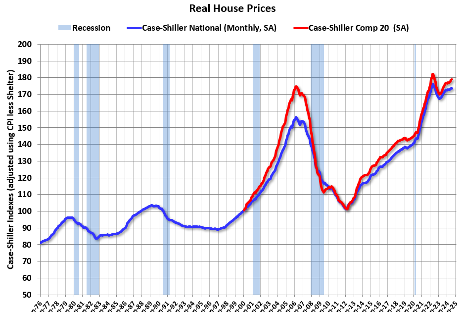 Sudah lebih dari 18 tahun sejak puncak gelembung. Dalam indeks harga rumah Case-Shiller bulan Juli pada hari Selasa, Indeks Nasional (SA) yang disesuaikan secara musiman, dilaporkan sebesar 74% di atas puncak gelembung pada tahun 2006. Namun, secara riil, Indeks Nasional (SA) adalah sekitar 11% di atas bubble peak (dan secara historis telah terjadi kenaikan harga rumah riil). Komposit 20, secara riil, berada 2% di atas puncak gelembung.